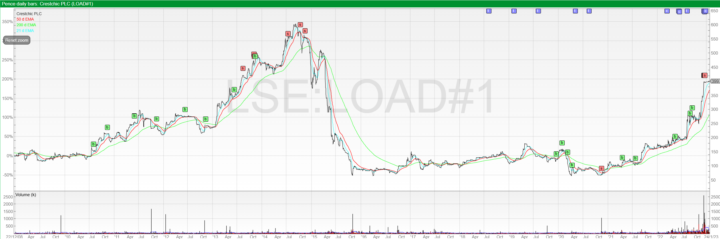 In late 2019 / early 2020 we started buying the shares again at prices from 75p, Tasman was put up for sale and in 2022 the company changed their name to ‘Crestchic’ to reflect their load bank business which was growing again and had assets considerably more valuable than identified on the balance sheet.