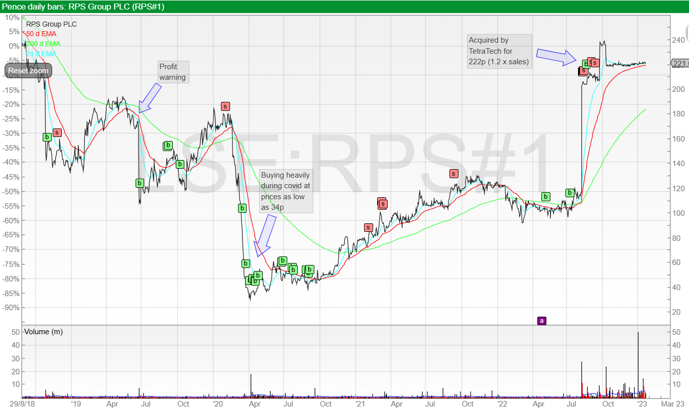In August 2022, a bidding war between Tier 1 peers WSP Group and TetraTech ended with RPS being acquired by TetraTech for 222p (1.2 x Sales).